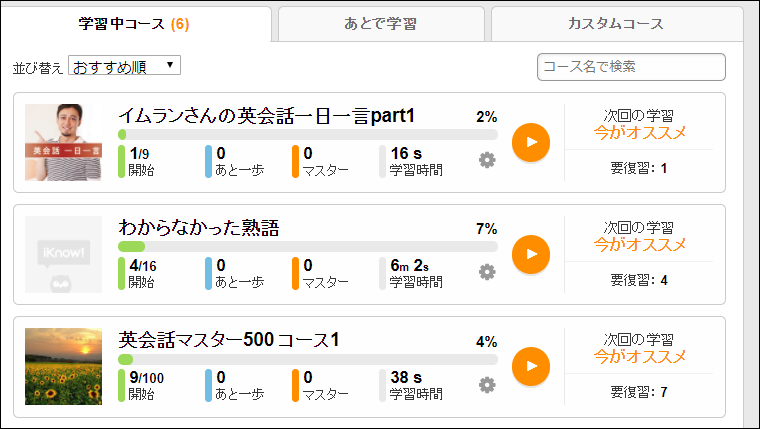 実際、私が自分で作成した「イムランさんの英会話一日一言」コースを、IKnowで公開していますので、もしご自分で登録するのが面倒くさい場合は、私のコースをダウンロードしてお使い頂く事が可能です(もちろんカスタムコースの共有に費用は発生しません。)