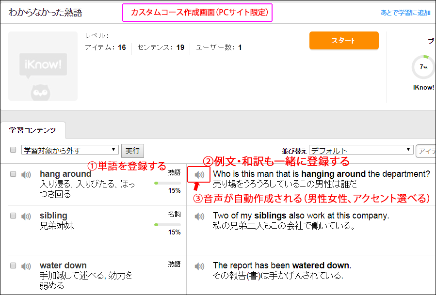 さて、このiKnowのカスタム作成コースには、単語と一緒に音声も登録可能です。